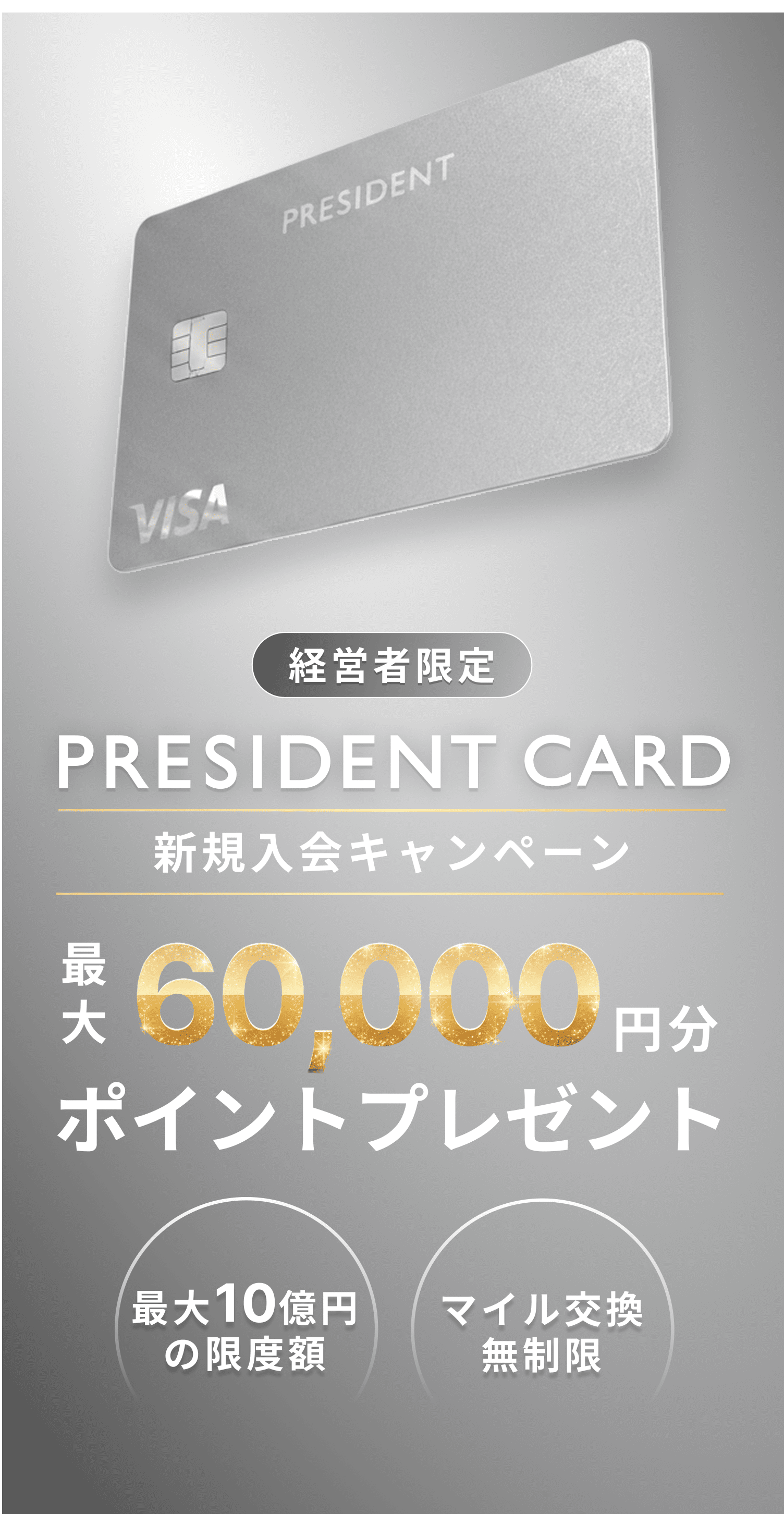 経営者限定の「PRESIDENT CARD」を新規でお申し込みいただいた方を対象に、最大60,000円分のポイントをプレゼントいたします。